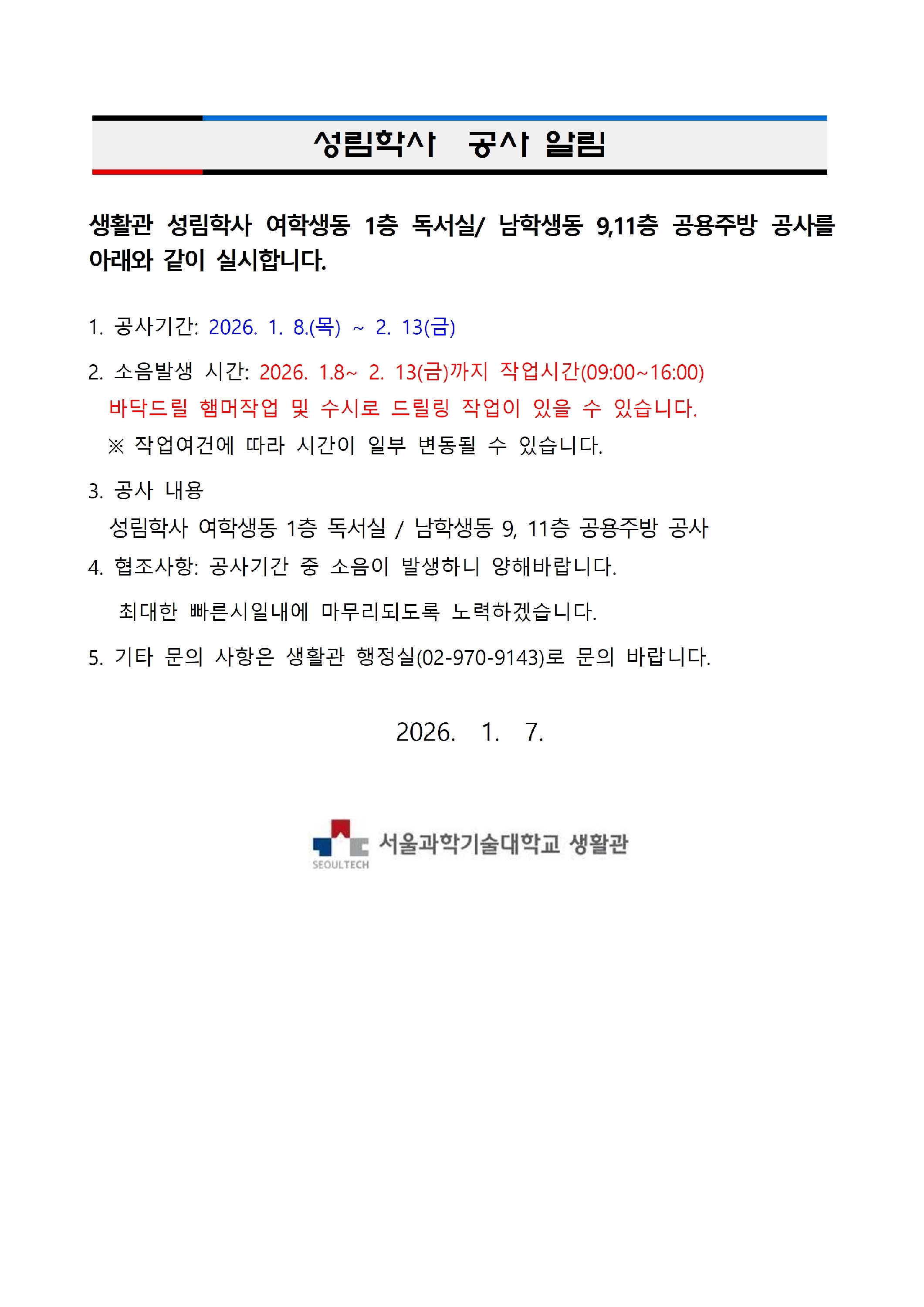 생활관 성림학사 남학생동,여학생동 공사 알림
