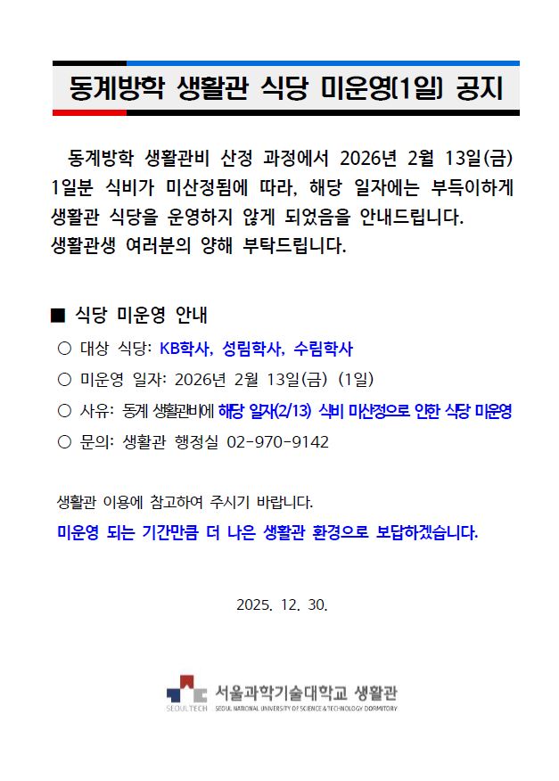 2025학년도 동계방학 생활관 식당 미운영(1일, 2.13.(금)) 공지