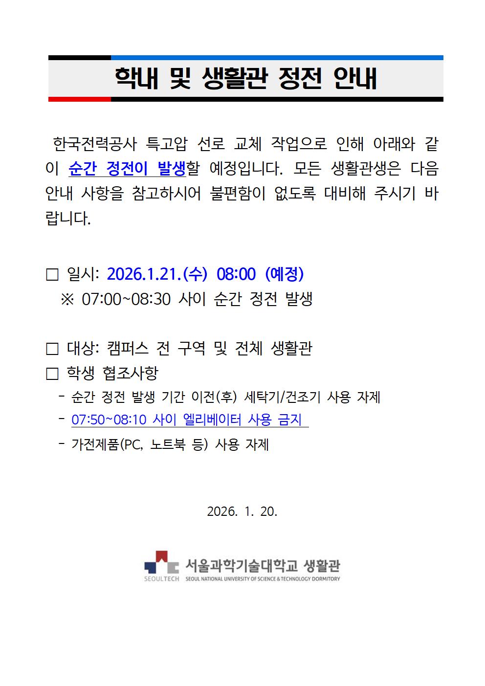 (긴급) 학내 및 생활관 정전 안내 (2026.1.21.(수) 오전 8시)
