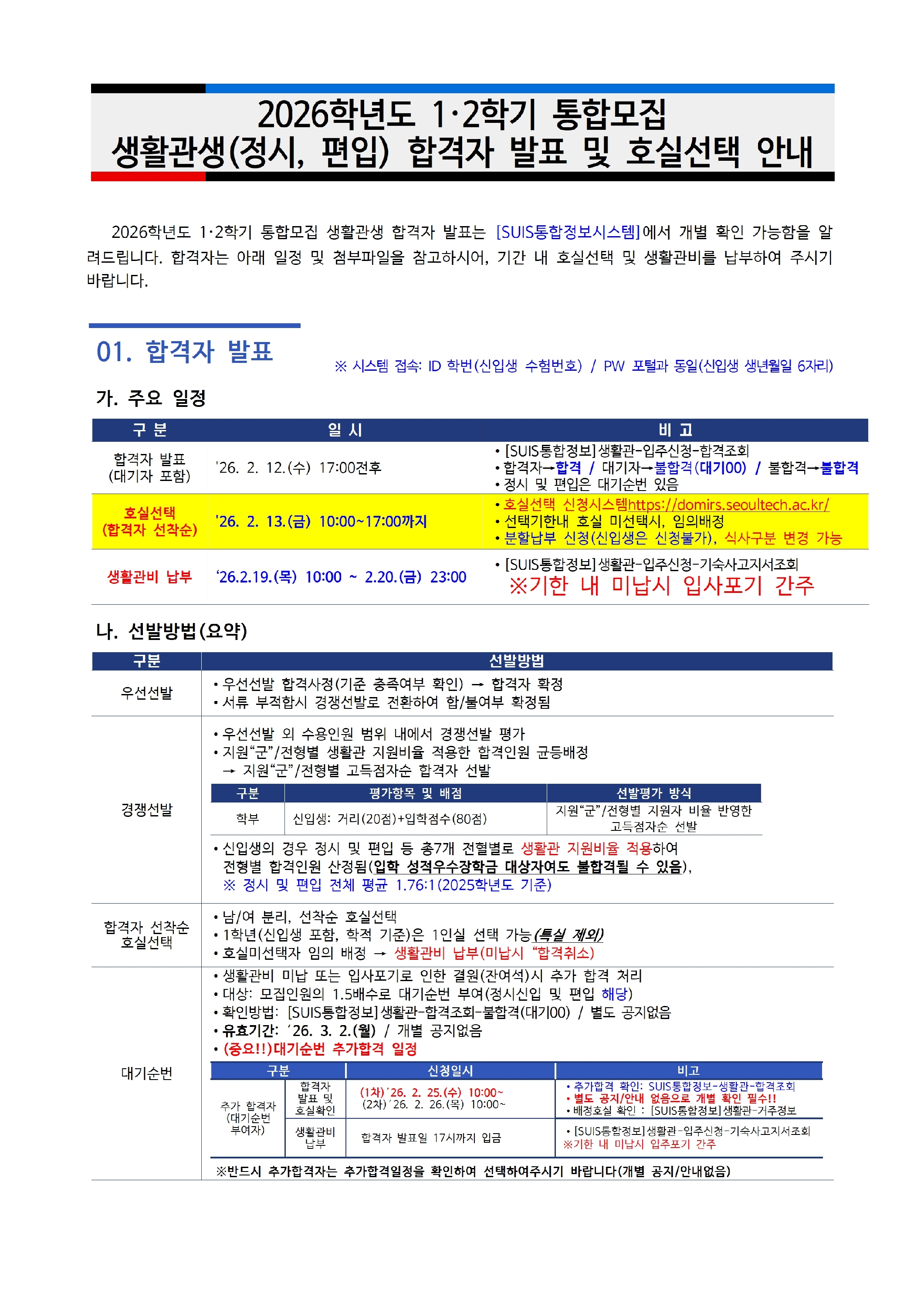 (정시,편입)2026학년도 1,2학기 통합모집 합격자 발표 및 호실선택 안내