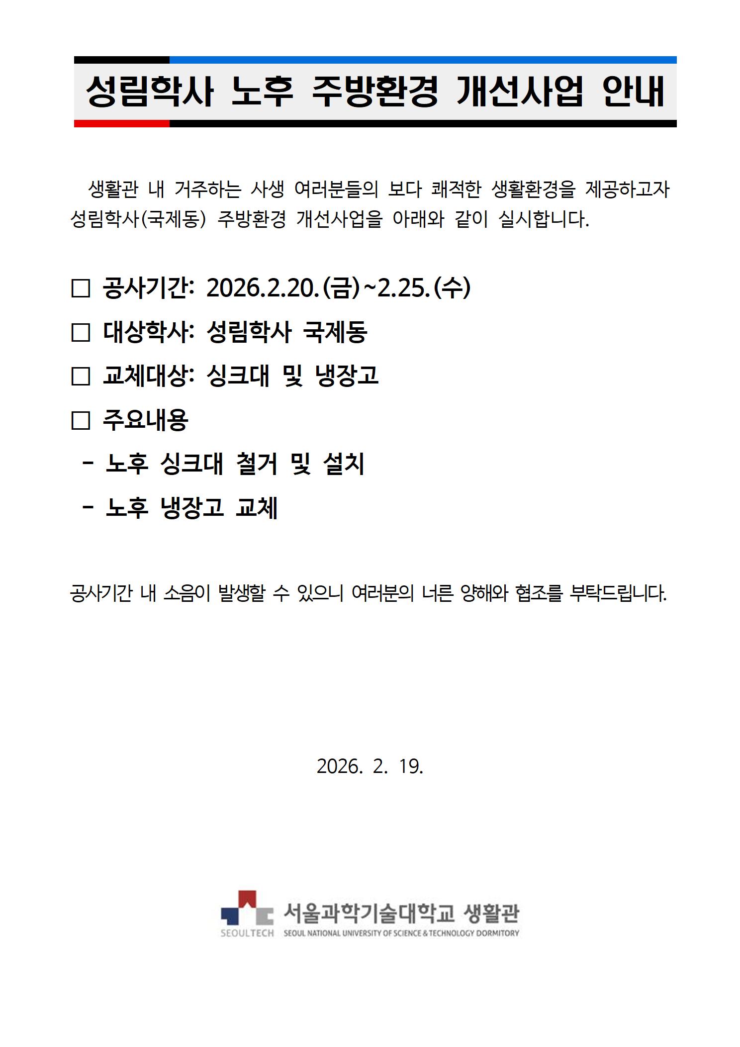 성림학사 노후 주방환경 개선사업 안내
