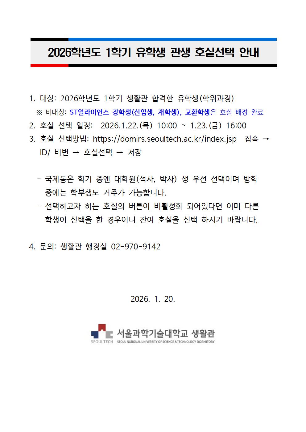 | 제목 | 2026 1st Semester Room Selection Notice for International Students | ||||