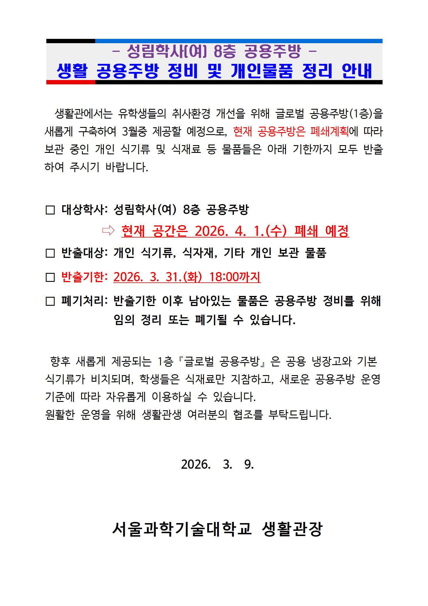 (성림학사 남) 8층 공용주방 정비 및 개인물품 정리 안내 Notice on Shared Kitchen